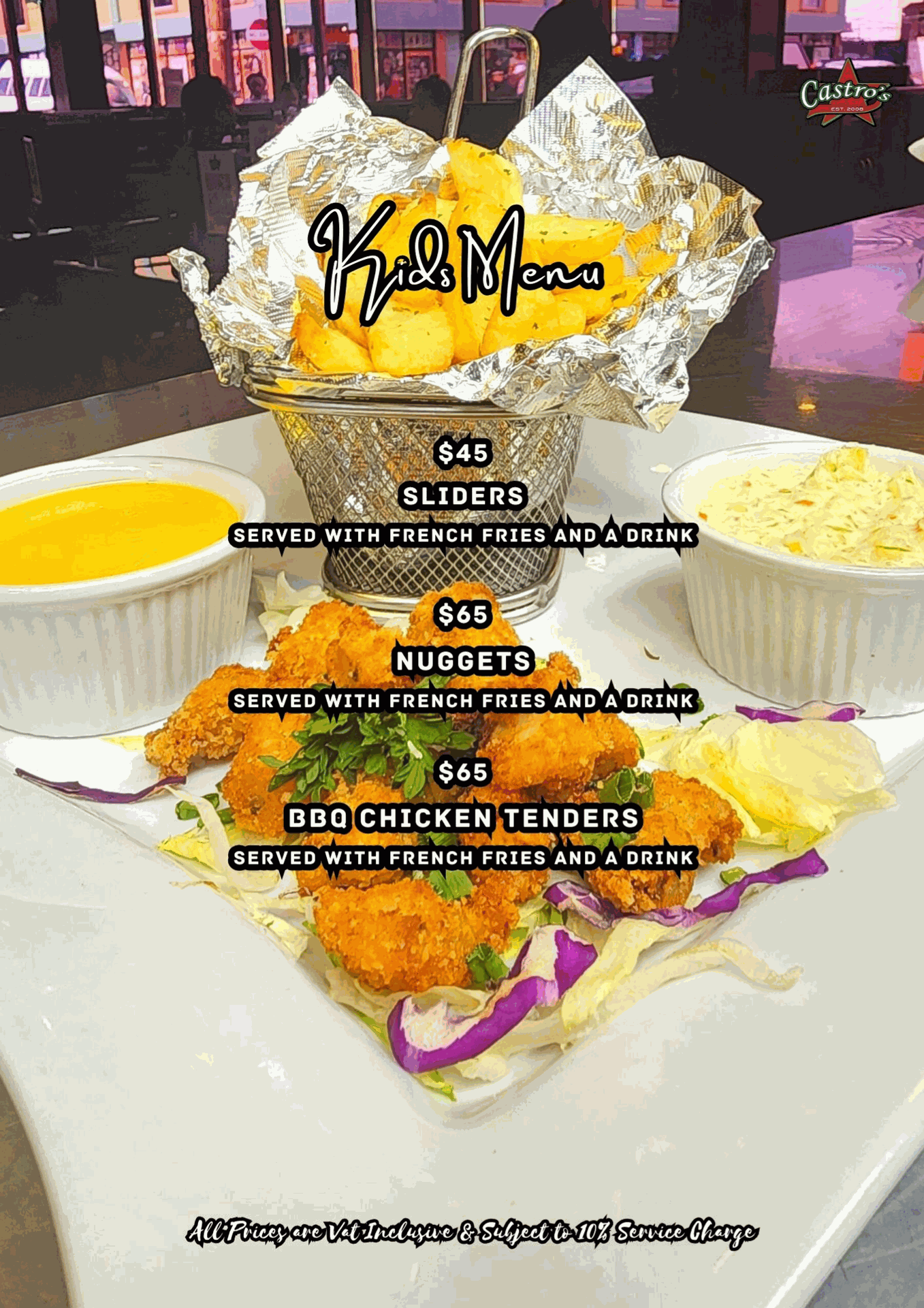Welcome to Castro's, where our Kids Menu is crafted just for young diners! With a variety of fun sides and flavors, we ensure every child has a delightful dining experience filled with quality and taste!