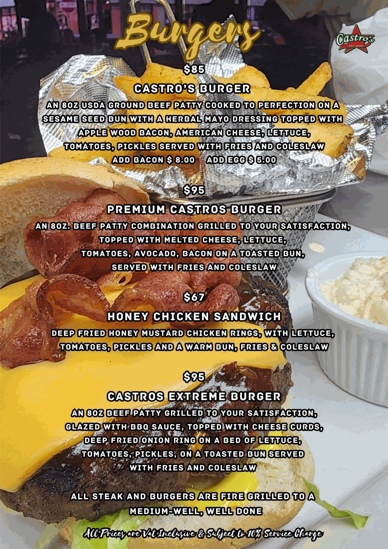 Dive into the heart of flavor with Castro's burger menu! Enjoy Castro's tasty burgers, crafted with fresh ingredients and grilled just right. With classic and unique options, there's a perfect burger for every craving.